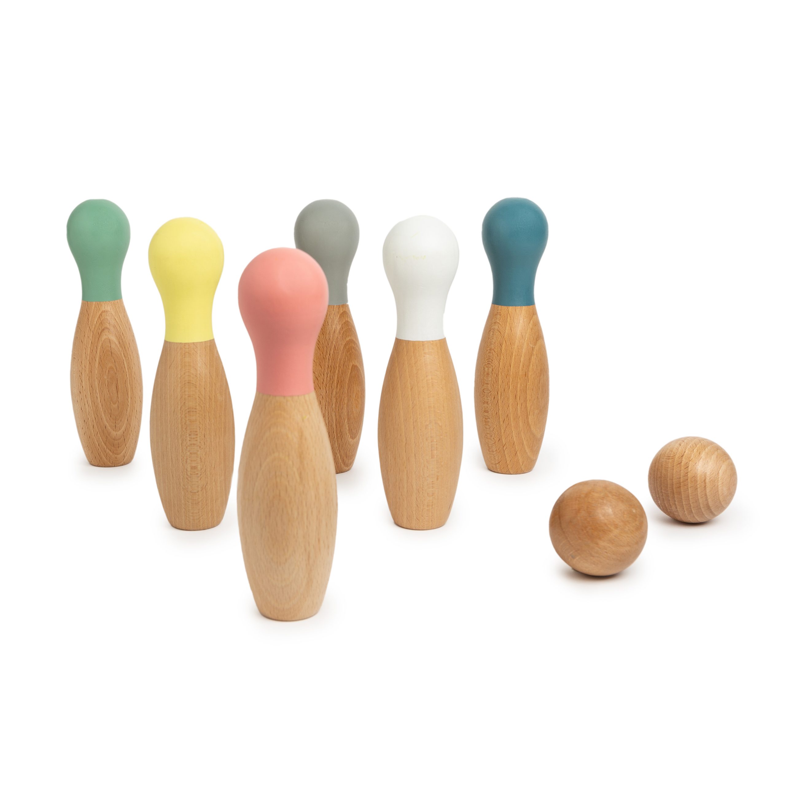 An all-time classic bowling set wooden toy, revamped by Nobodinoz with a retro design and candy colours. This set is perfect for family playtime and also serves as a charming decor piece for any room.