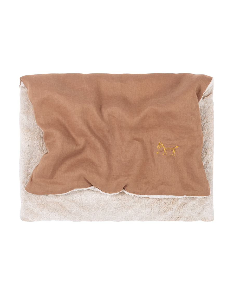 With one side in embroidered French linen and the other in extra-soft faux fur, it’s ideal for relaxing, reading, or snuggling up in comfort.