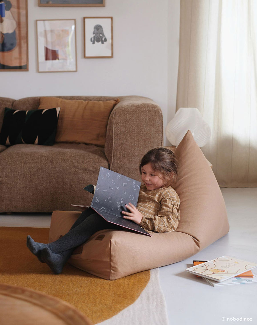 Fall for the Oasis beanbag, the perfect companion for reading, playing or resting. Thanks to its long shape and adaptable filling, this beanbag offers ultimate comfort. Its subtle colours make it a must-have for any child’s bedroom. Lightweight and easy to carry thanks to its faux-leather handle.
