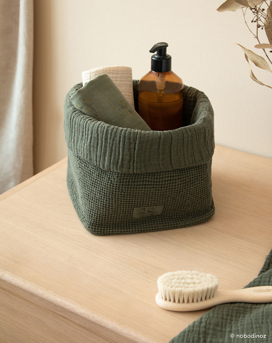 The Wabi-Sabi basket combines the elegance of honeycomb with the softness of washed organic cotton double muslin. Ideal for storing small toys or baby changing accessories, it’s the decorative element you always need.