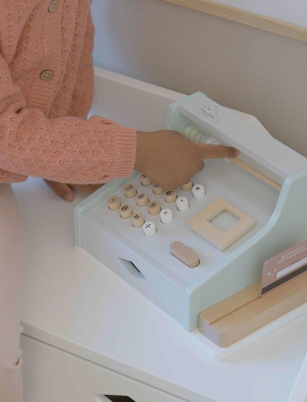 Wooden Cash Register complete with money and credit card in unique Cam Cam design. The Cash Register features a classical retro-inspired aesthetic and is an indispensable match for the Play Shop. The ideal set for many hours of true-to-life role play for the entire family to join. Comes with money + credit card. Produced from FSC 100% certified wood.
